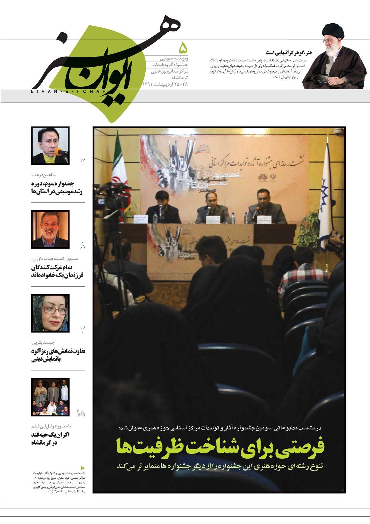 پنجمین شماره از ایوان هنر نشریه داخلی سومین جشنواره آثار و تولیدات مراکز استانی حوزه هنری منتشر شد.